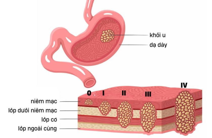 Giai đoạn 0: tế bào ung thư mới xuất hiện ở lớp niêm mạc dạ dày. Đây còn được gọi là ung thư biểu mô, là giai đoạn sớm của ung thư dạ dày.
