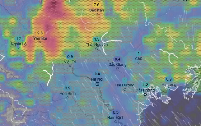 Dự báo miền Bắc có mưa diện rộng vào ngày 17/4 (những con số trong hình là lượng mưa trong khoảng 3 giờ). Ảnh: Ventusky, ECMWF.