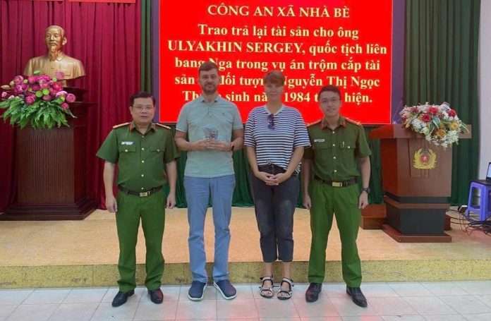 Công an xã Nhà Bè, TPHCM, cho biết đơn vị vừa tổ chức trao trả lại tài sản bị mất trộm cho vợ chồng ông Ulyakhin Sergey (quốc tịch Nga).